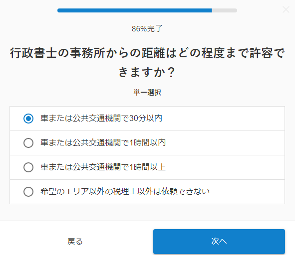 「許認可に強い行政書士」等では、依頼者の方が行政書士の先生との対面ミーティングを希望する場合、事務所までの移動時間の許容範囲を伺う質問を追加しました。