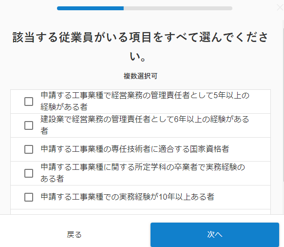 「建設業許可の申請に強い行政書士」では、建設業許可の要件にどの程度該当するかを伺う質問を追加しました。