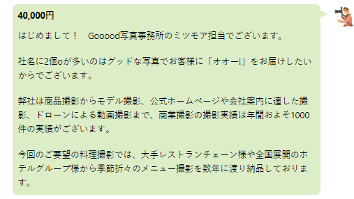 また、記載可能な有名企業などの取引実績があれば、ぜひ書き添えてみてください。ポートレートなどの見せられる実績がある場合は、メッセージにも添付をすることをオススメします。「プロフィール欄や自社のホームページに載せているから不要では?」という意見もありますが、依頼者がそこまで見に行く保証はありません。依頼者に手間を掛けさせないこともWeb上のコミュニケーションでは重要になります。