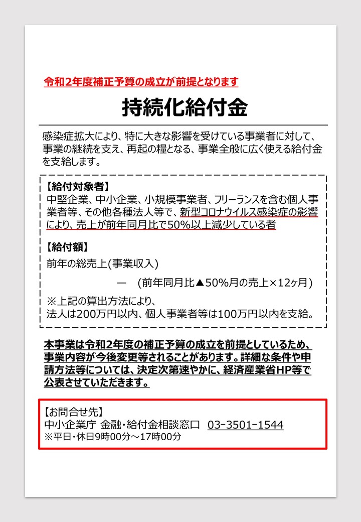 - 前年同月比の売り上げが、50%以上減った個人事業主や中小企業を対象とする