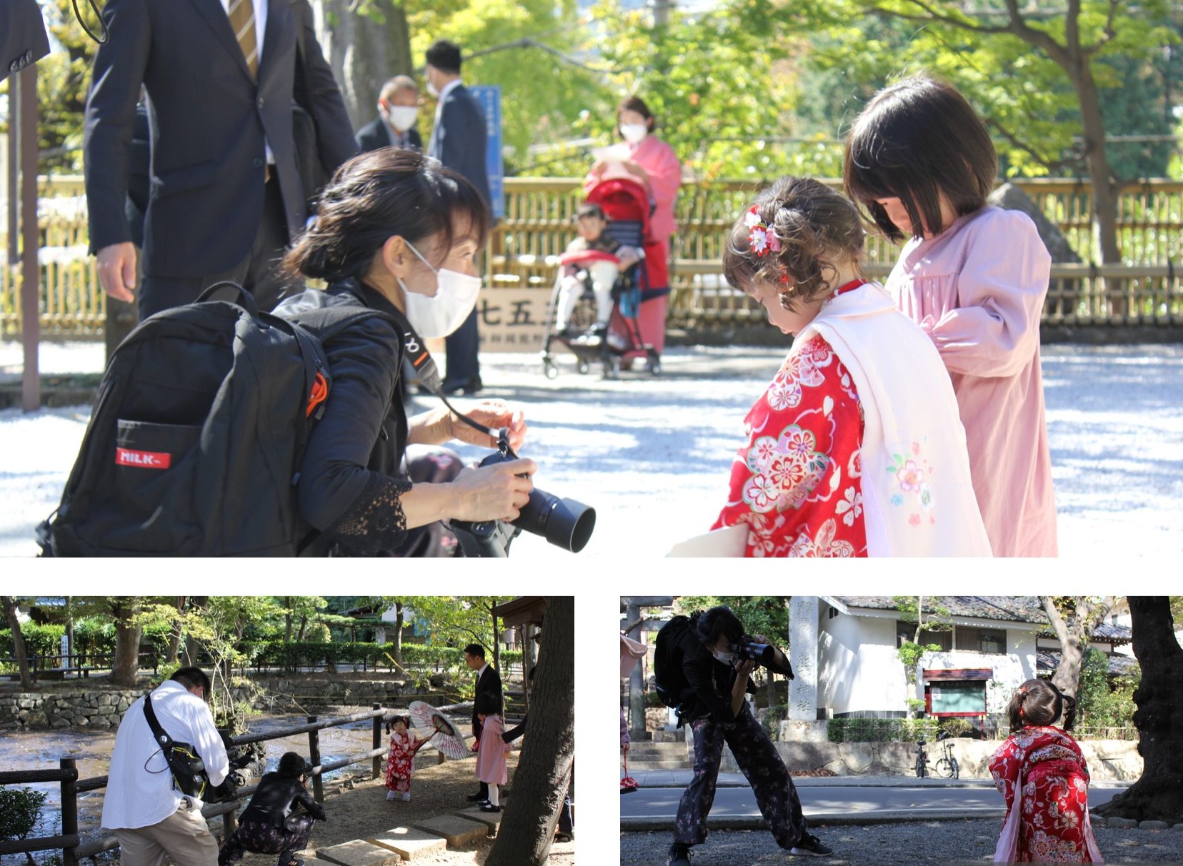 もし美容院で着付けをすれば慣れない着物姿でまた神社まで移動しなくてはならないし、子どもさんが動いたり走ったりするので着崩れてしまう。当然のことですよね。その上で長時間、着物姿で撮影するのですから子どもさんのストレスも高まりぐずったり飽きちゃったり。なかなか良い表情を撮ること自体が難しいんです。
